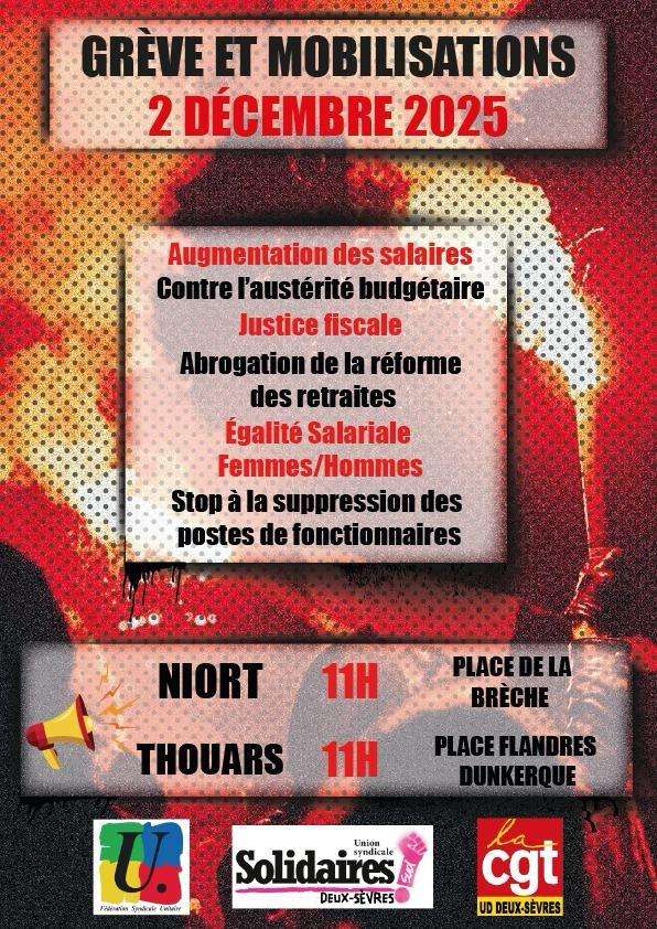 Le 2 décembre toutes et tous mobilisé·es contre l’austérité et pour nos salaires ! Les mesures d'injustices fiscales, de regressions sociales et de salaires au rabais perdurent, amplifions la mobilisation pour obtenir une politique plus juste ! 11 h place de la Breche à Niort 11 h place Flandres-Dunkerque à Thouars