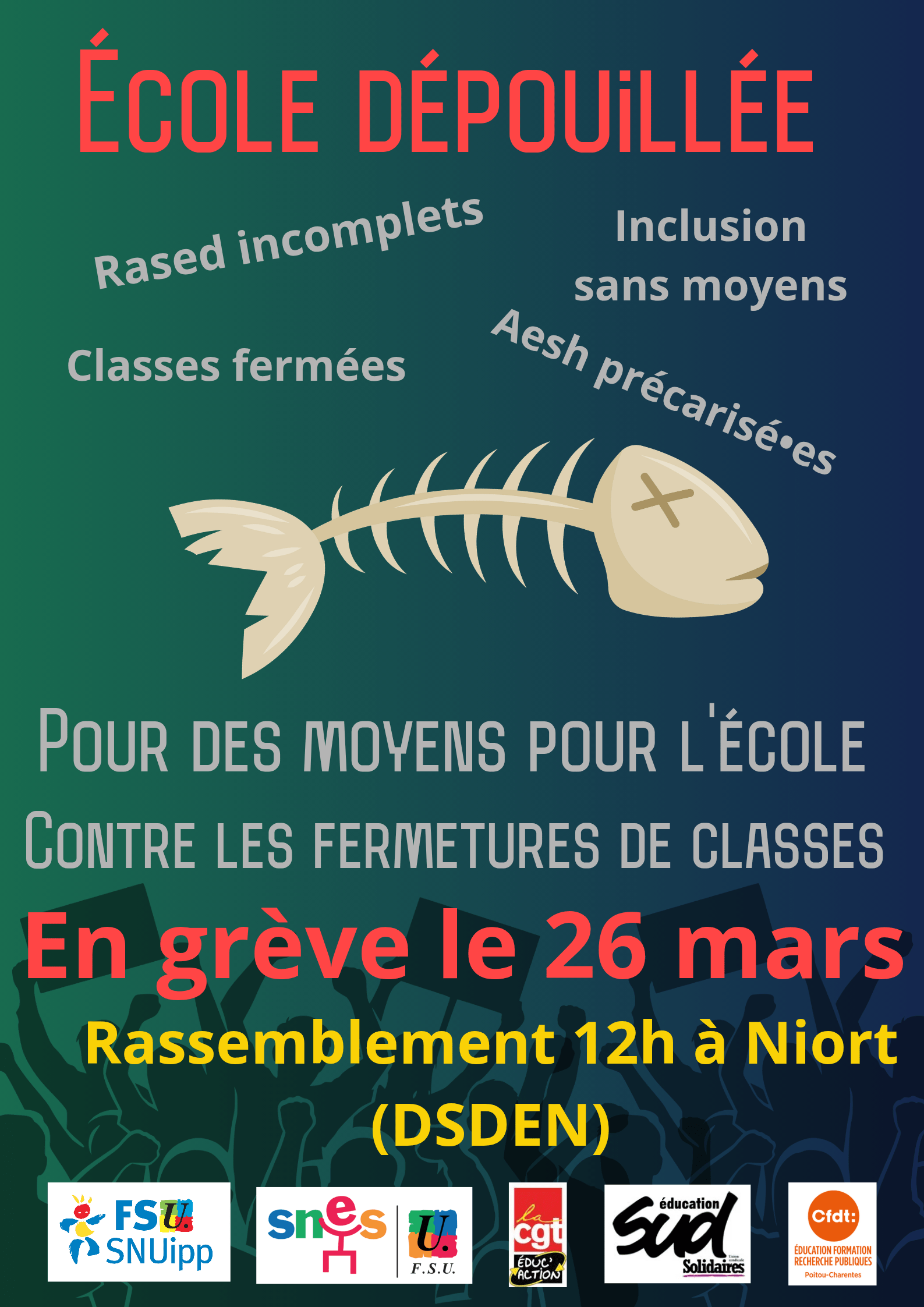 Mardi 31 mars et le Jeudi 2 avril, l'austérité pour l'éducation ça suffit ! Mobilisons-nous, pour nos salaires, pour des moyens pour l'école et pour améliorer nos conditions de travail ! Mardi 31 mars : Appel à la grève et au rassemblement devant la préfecture de Niort à partir de 12 h 00. Jeudi 2 Avril : Rassemblement devant la préfecture de Niort à partir de 16 h 30, [...]